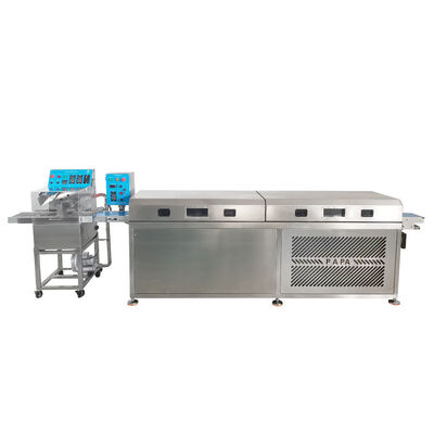 Small Commercial tunnel cooling chocolate enrobing machine consists of small chocolate enrober and 3P Chocolate cooling tunnel. The Commercial type chocolate enrobing machine with cooling tunnel is designed for making chocolate coated products, such as protein bar, energy bar, cereal bar, granola bars, energy ball, date ball, truffles, cookies, biscuits, crackers, pies, cakes, breads, wafer sticks, egg rolls, fruits, nuts, candy bars, donuts and so on.